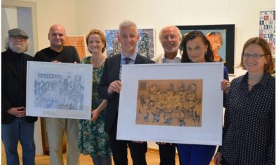 Bei der Übergabe der Haggadah im Kunsthaus Leer: Die Künstler Daniel Jelin (v. l.), Ricardo Fuhrmann, Susanne Bracht, Leiterin der Ehemaligen Jüdischen Schule, Landrat Matthias Groote,...