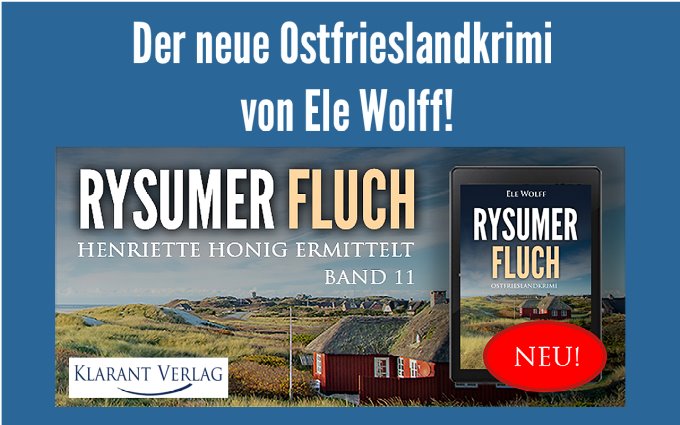 Kri­mi­au­to­rin Ele Wolff hat mit “Rysumer Fluch” einen neu­en Ost­fries­land­kri­mi im Klar­ant Ver­lag ver­öf­fent­licht. Ihre Pri­vat­de­tek­ti­vin Hen­ri­et­te Honig ermit­telt in dem War­fen­dorf Rysum in der Nähe der Stadt Emden. In dem klei­nen, idyl­li­schen Ort kennt jeder jeden und weiß viel über den ande­ren. Vor­sich­tig ver­sucht Hen­ri­et­te, mit den Ein­woh­nern ins Gespräch zu kom­men um den unge­klär­ten Tod von Bet­je Fran­ken zu entschlüsseln.