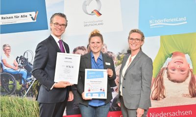 Dr. Berend Lindner (Staatssekretär im Niedersächsischen Ministerium für Wirtschaft, Arbeit, Verkehr und Digitalisierung) und Meike Zumbrock (Geschäftsführerin der Tourismus Marketing Niedersachsen GmbH) übereichen Carolin Ganschinietz (Marketingleiterin...